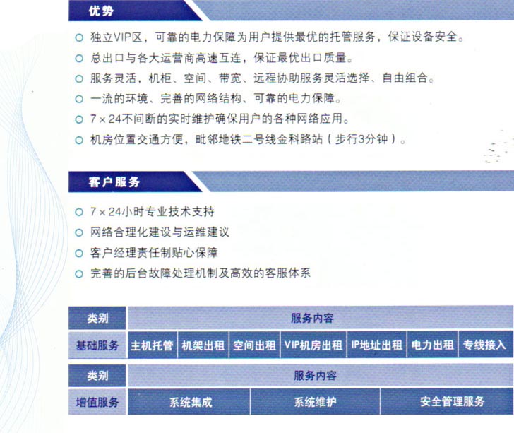 东方有线可向用户提供主机托管、机架出租、空间出租、VIP机房出租、IP地址出租、电力出租、专线接入等服务以及系统集成、系统维护(系统配置、数据备份、故障排除服务)、安全管理服务(如带宽管理、流量分析、负载均衡、入侵检测、系统漏洞诊断)。