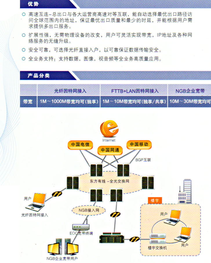东方有线的互联网接入产品主要包括光纤因特网接入,FTTB+LAN因特网接入及NGB企业宽带接入,能够保障用户的各种带宽及安全性需求。